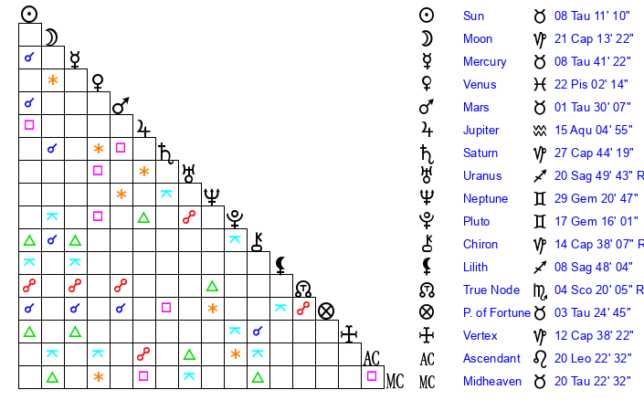 | Uranus | 20 Sagittarius 46 | 26 Taurus 15 | 17 Sagittarius 13 |