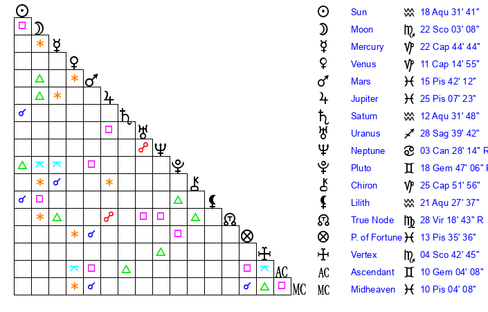 | Sun | 18 Aquarius 32 | 20 Aquarius 11 | 17 Gemini 26 |