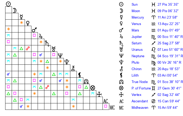 | Moon | 9 Pisces 0 | 16 Scorpio 22 | 13 Leo 58 |