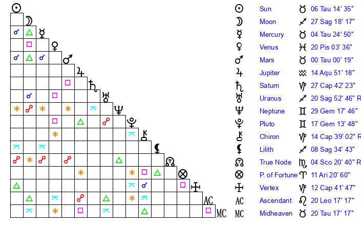 | Pluto | 17 Gemini 14 | 3 Aquarius 48 | 19 Gemini 37 |
