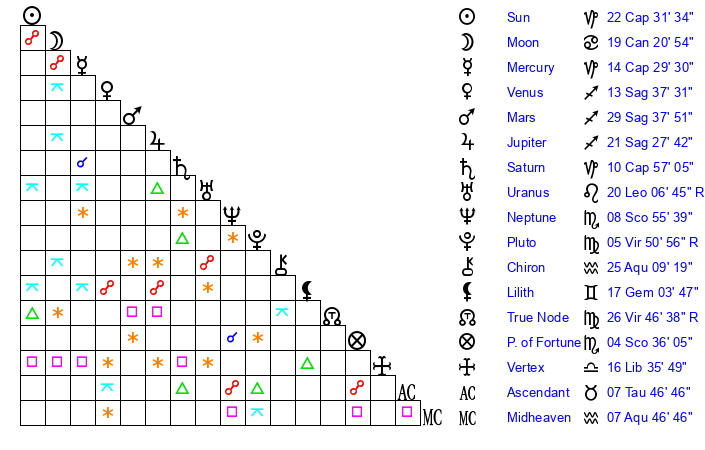 | Moon | 19 Cancer 23 | 20 Cancer 55 | 7 Sagittarius 19 |