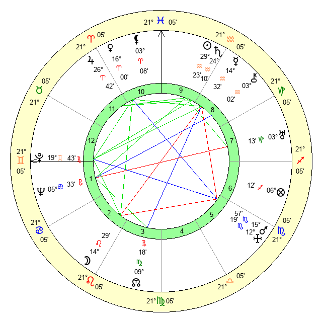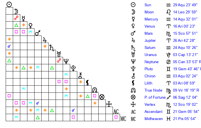 | Sun | 29 Aquarius 24 | 0 Pisces 17 | 26 Gemini 45 |