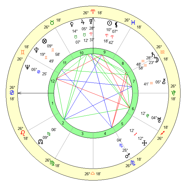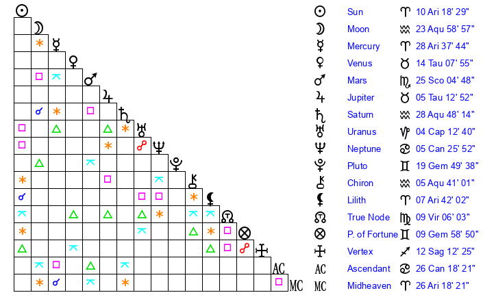 | Sun | 10 Aries 19 | 11 Aries 14 | 5 Leo 52 |
