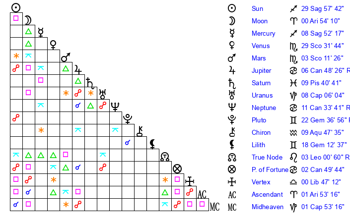 | Sun | 29 Sagittarius 58 | 1 Capricorn 6 | 29 Aries 28 |