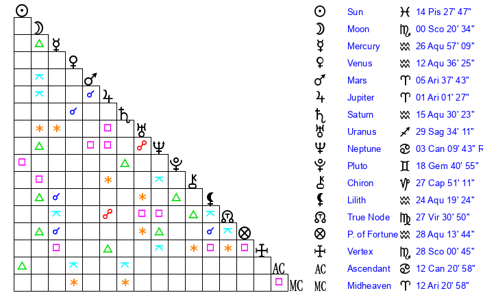 | Moon | 0 Scorpio 17 | 29 Taurus 6 | 25 Pisces 29 |
