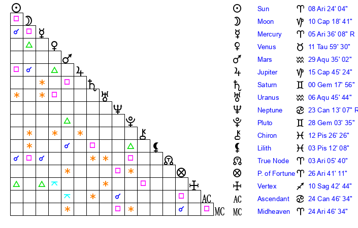 | Moon | 10 Capricorn 20 | 12 Aries 48 | 12 Aquarius 46 |
