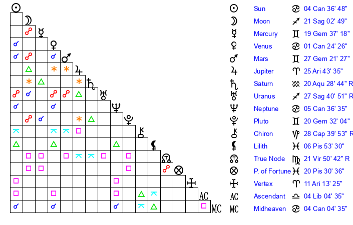 | Moon | 20 Sagittarius 56 | 22 Cancer 20 | 16 Taurus 8 |