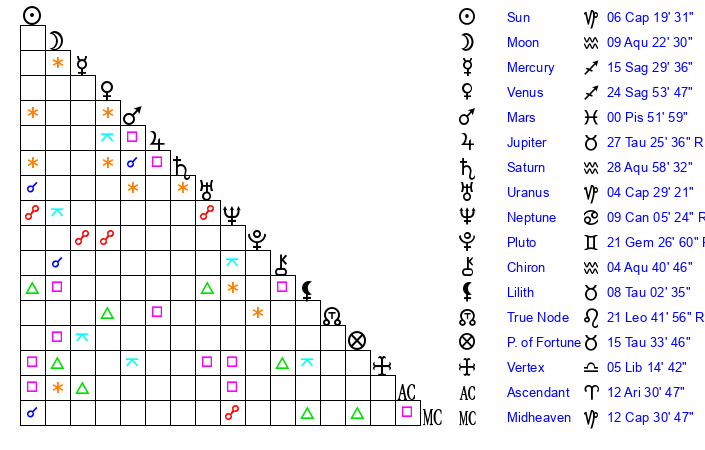 | Sun | 6 Capricorn 19 | 7 Capricorn 13 | 6 Taurus 31 |