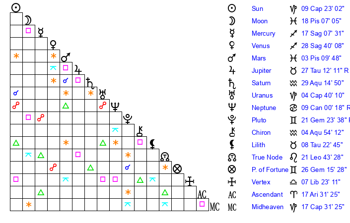 | Moon | 18 Pisces 9 | 2 Gemini 34 | 26 Cancer 44 |