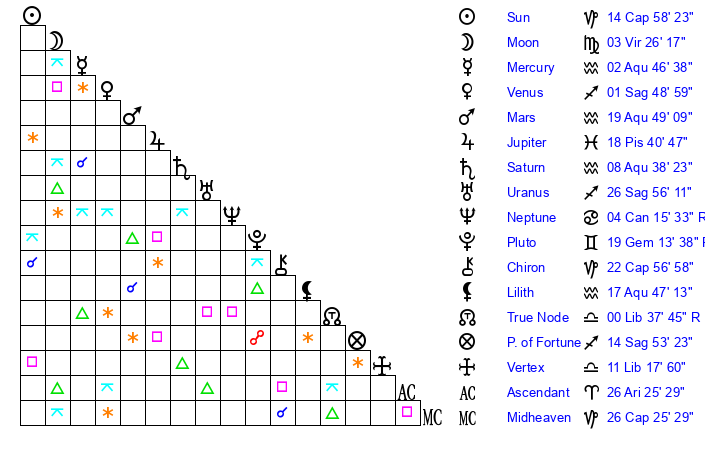 | Moon | 3 Virgo 10 | 29 Leo 56 | 18 Aquarius 59 |