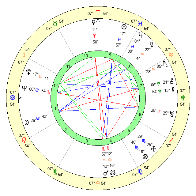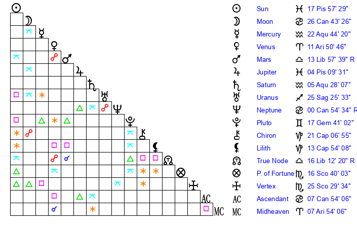 | Sun | 17 Pisces 57 | 19 Pisces 22 | 16 Cancer 17 |