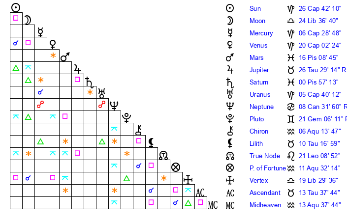 | Sun | 26 Capricorn 42 | 27 Capricorn 50 | 24 Taurus 54 |
