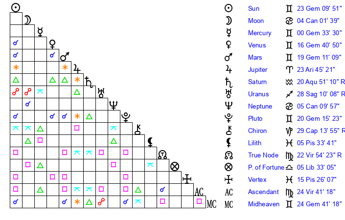 | Pluto | 20 Gemini 16 | 3 Aquarius 26 | 21 Gemini 38 |