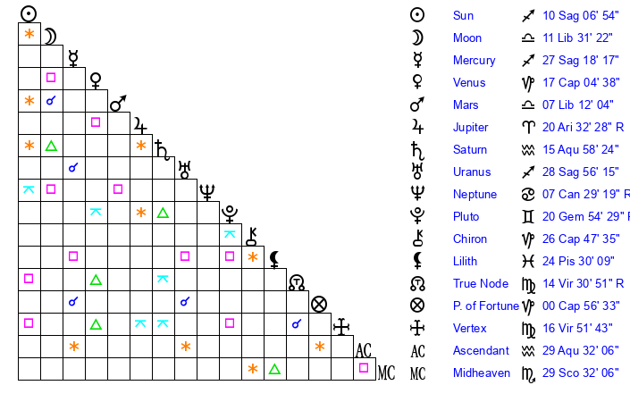 | Moon | 11 Libra 35 | 8 Taurus 43 | 17 Pisces 40 |