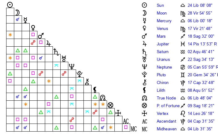 | Moon | 28 Virgo 52 | 24 Virgo 15 | 11 Pisces 7 |