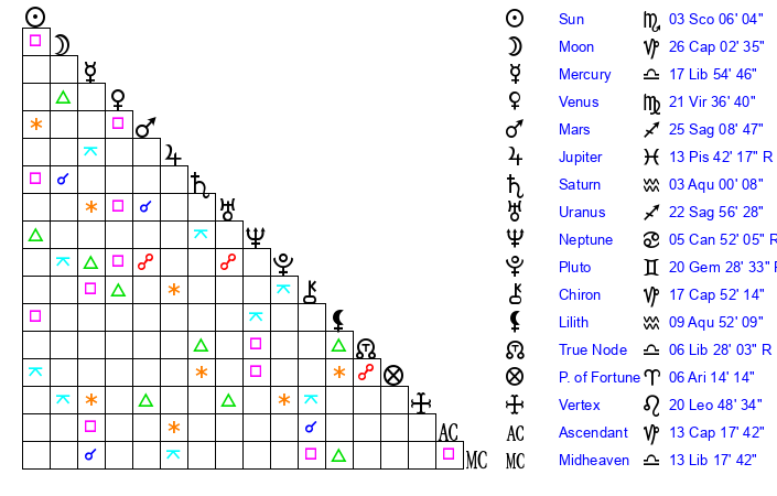 | Moon | 26 Capricorn 13 | 12 Capricorn 8 | 5 Cancer 26 |