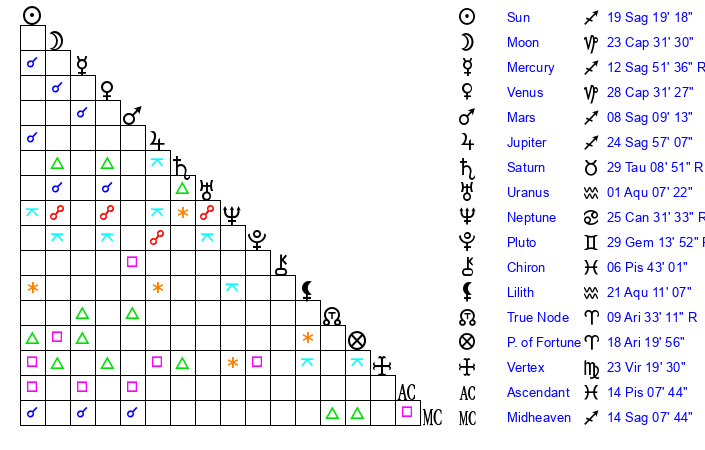 | Moon | 23 Capricorn 34 | 18 Virgo 1 | 9 Pisces 57 |