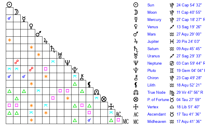 | Moon | 11 Capricorn 36 | 26 Leo 54 | 7 Gemini 39 |