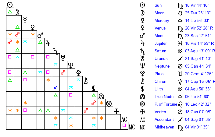 | Moon | 25 Taurus 20 | 27 Taurus 2 | 25 Scorpio 8 |