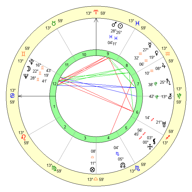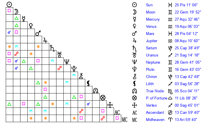 | Sun | 25 Pisces 11 | 26 Pisces 21 | 24 Cancer 8 |
