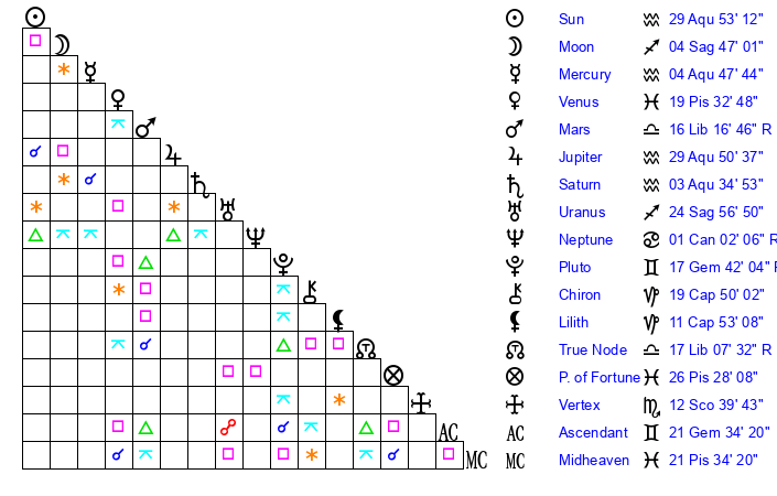 | Sun | 29 Aquarius 53 | 1 Pisces 18 | 29 Gemini 7 |