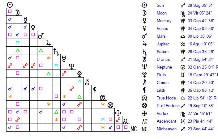 | Uranus | 21 Sagittarius 52 | 28 Taurus 17 | 25 Sagittarius 22 |