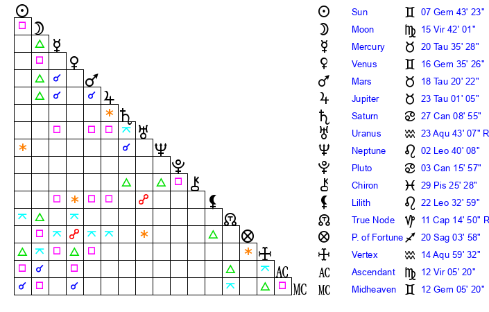 | Sun | 7 Gemini 43 | 8 Gemini 34 | 21 Virgo 17 |