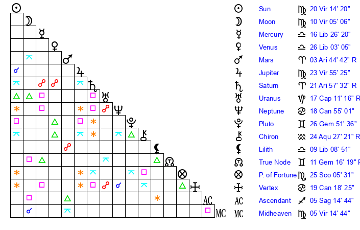 | Sun | 20 Virgo 15 | 21 Virgo 9 | 16 Capricorn 33 |