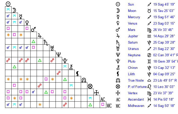 | Uranus | 21 Sagittarius 20 | 28 Taurus 35 | 25 Sagittarius 30 |