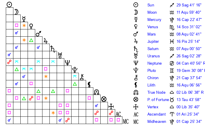 | Moon | 12 Aquarius 3 | 0 Aquarius 40 | 25 Cancer 44 |