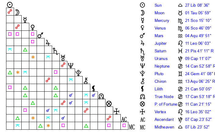 | Sun | 27 Libra 9 | 28 Libra 33 | 26 Aquarius 39 |