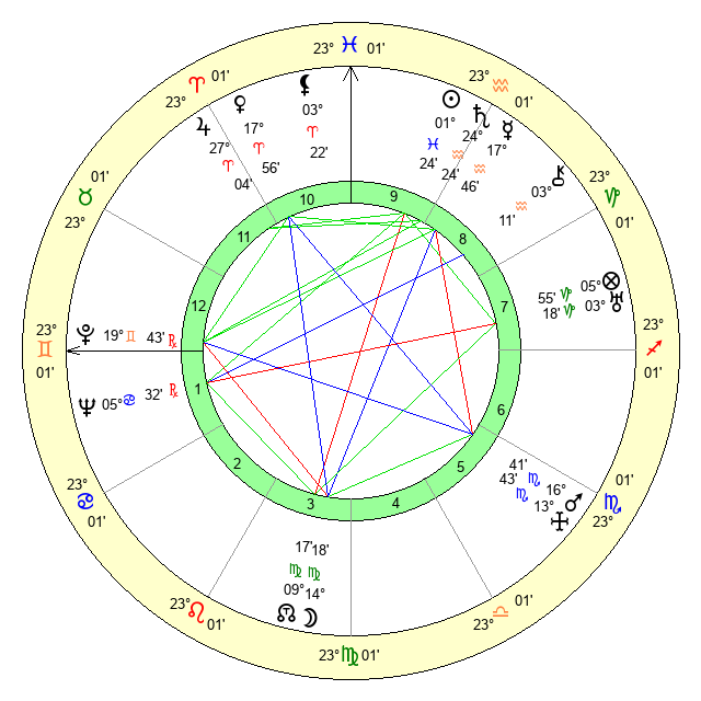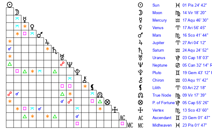 | Moon | 14 Virgo 14 | 1 Sagittarius 51 | 12 Aquarius 10 |