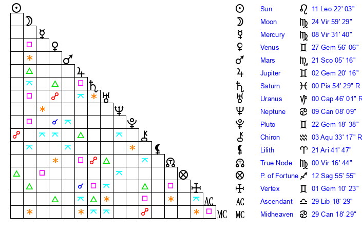 | Moon | 24 Virgo 59 | 14 Sagittarius 31 | 24 Aquarius 33 |