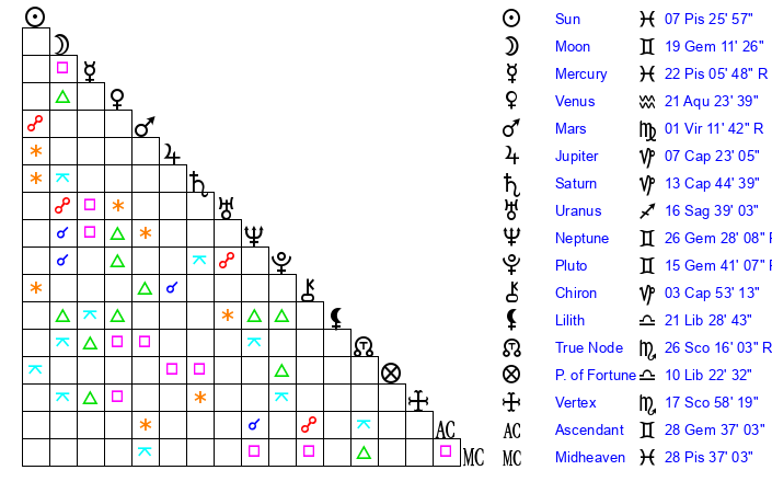 | Neptune | 26 Gemini 28 | 28 Pisces 48 | 29 Gemini 19 |