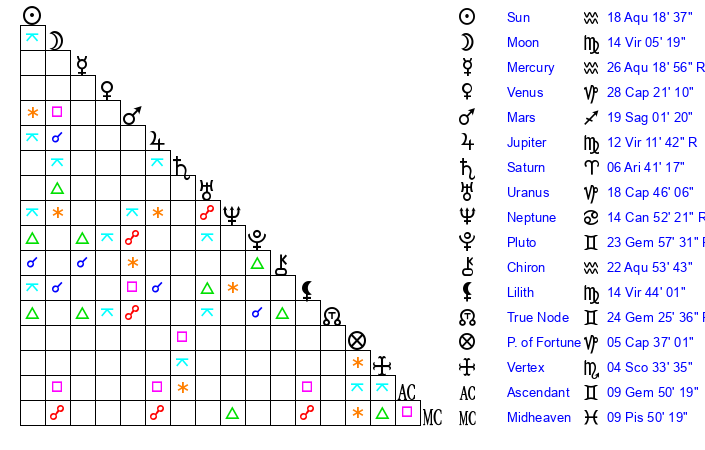 | Sun | 18 Aquarius 19 | 19 Aquarius 10 | 12 Gemini 27 |