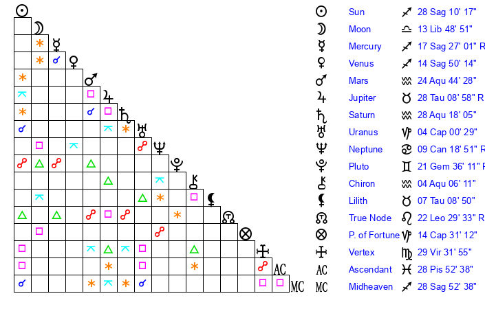 | Saturn | 28 Aquarius 44 | 25 Pisces 31 | 11 Pisces 56 |