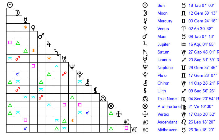 | Pluto | 17 Gemini 29 | 3 Aquarius 48 | 19 Gemini 41 |