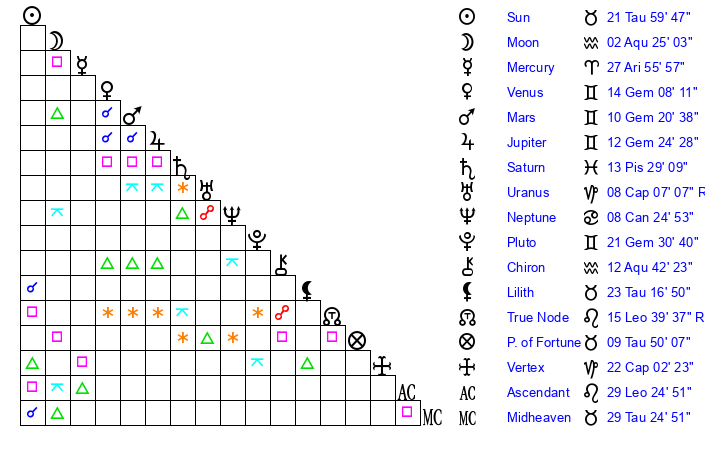 | Pluto | 21 Gemini 31 | 3 Aquarius 47 | 23 Gemini 44 |