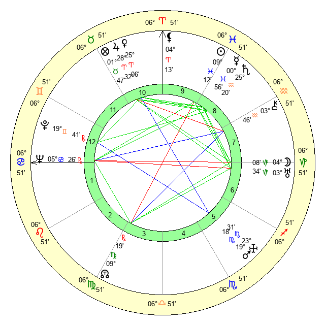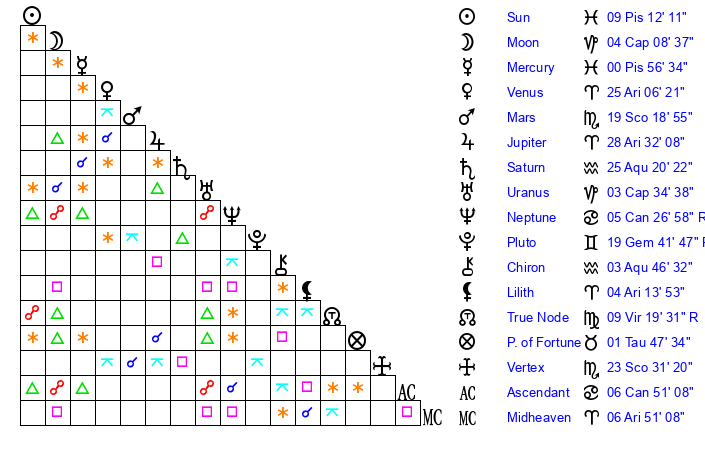 | Sun | 9 Pisces 12 | 10 Pisces 6 | 6 Cancer 3 |