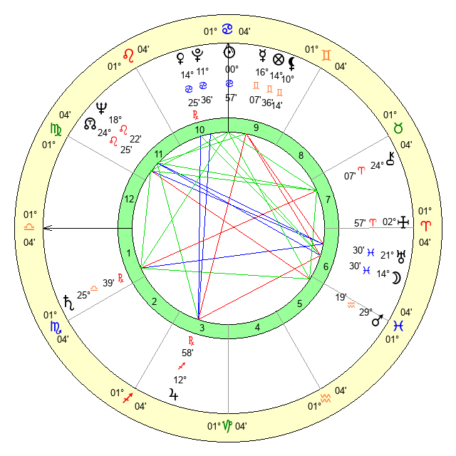 | Sun | 0 Cancer 57 | 1 Cancer 31 | 8 Libra 14 |