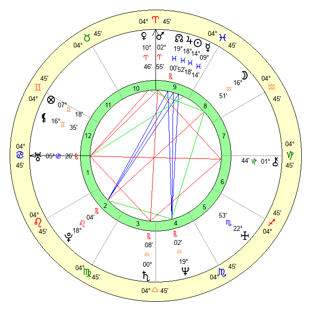 | Mars | 2 Aries 56 | 17 Cancer 34 | 27 Taurus 55 |