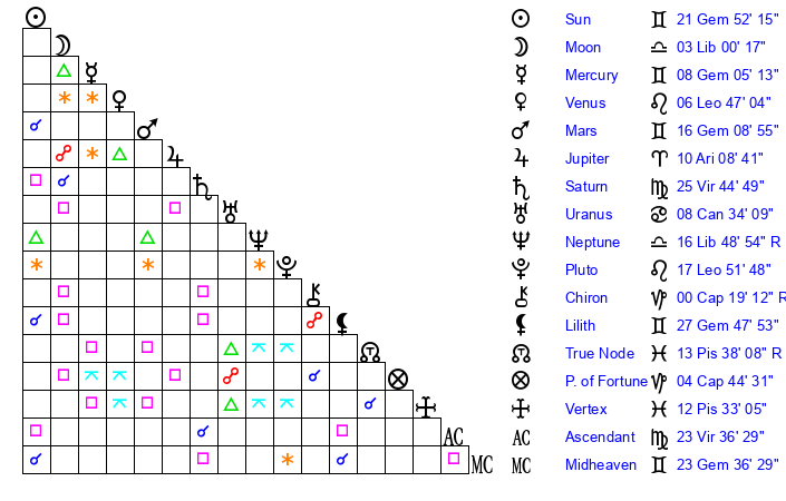 | Moon | 2 Libra 55 | 20 Capricorn 30 | 27 Gemini 43 |