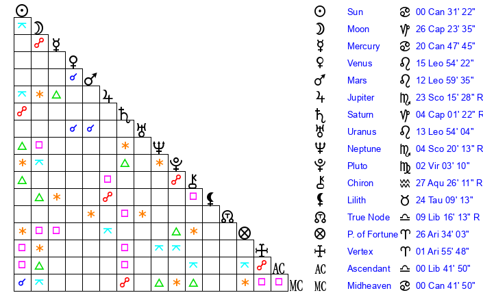 | Moon | 26 Capricorn 24 | 23 Taurus 52 | 18 Gemini 37 |