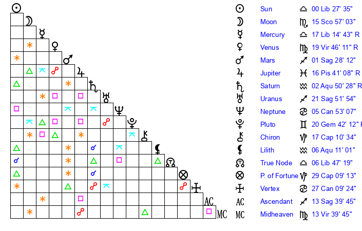 | Mercury | 17 Libra 14 | 10 Libra 54 | 18 Capricorn 17 |