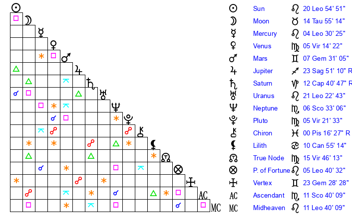 | Moon | 15 Taurus 2 | 17 Aries 50 | 20 Virgo 3 |