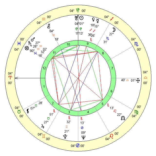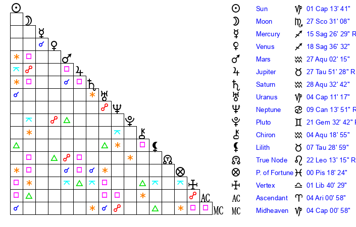 | Moon | 27 Scorpio 40 | 13 Aquarius 6 | 20 Aries 54 |