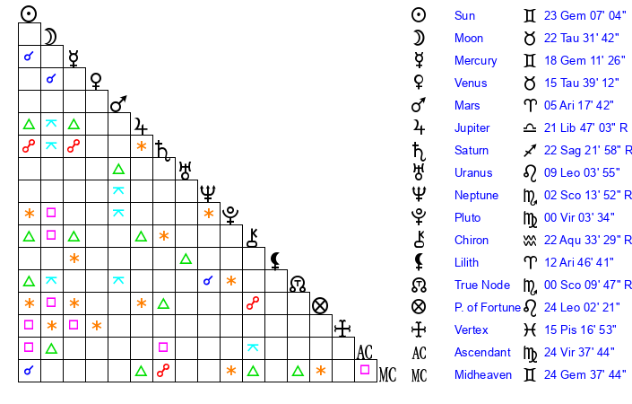 | Mercury | 18 Gemini 12 | 11 Cancer 4 | 2 Virgo 32 |
