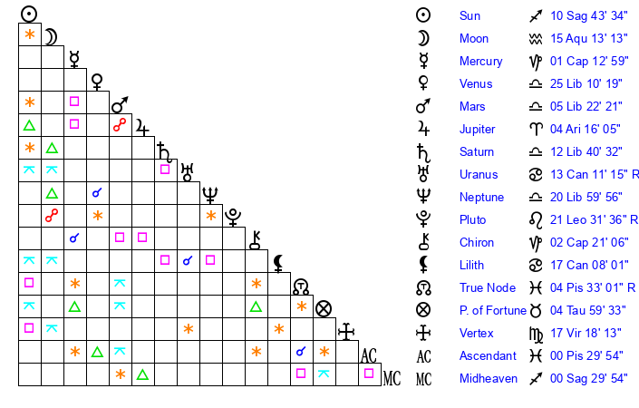 | Saturn | 13 Libra 10 | 25 Pisces 5 | 15 Libra 6 |