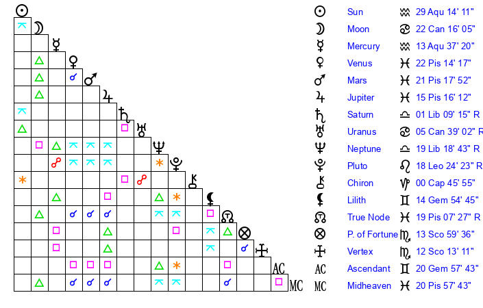 | Sun | 29 Aquarius 14 | 0 Pisces 17 | 12 Taurus 27 |