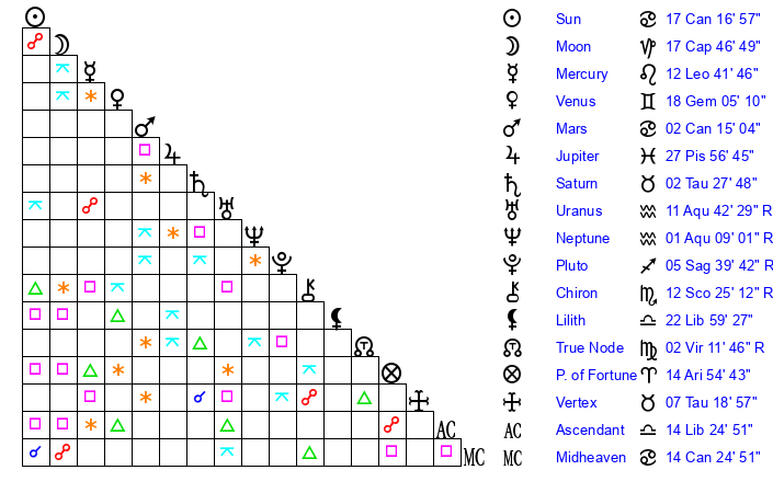 | Moon | 17 Capricorn 50 | 4 Capricorn 16 | 12 Capricorn 52 |